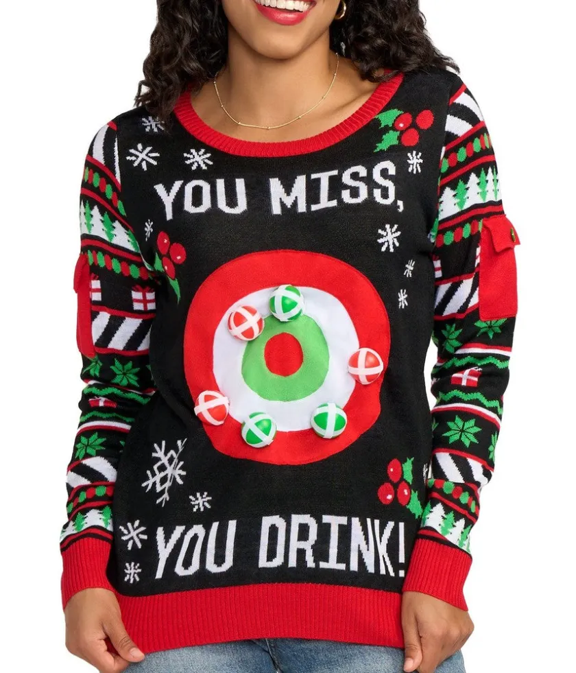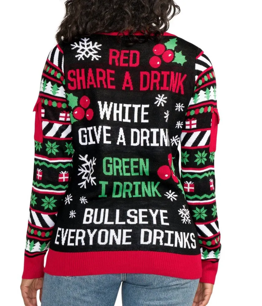 This women’s drinking game ugly christmas sweater isn’t just fun for the person wearing it, it’s fun for the whole party! It comes with six velcro balls that will stick to the sweater when thrown. It also comes with a rule card that will lay down the law of the Tipsy Elves Drinking Game. The target is a decent size but as the game goes on, it will become increasingly hard to hit and hopefully that means everyone is having a blast! Check out the back of the sweater for a reminder of the rules and remember to drink responsibly.